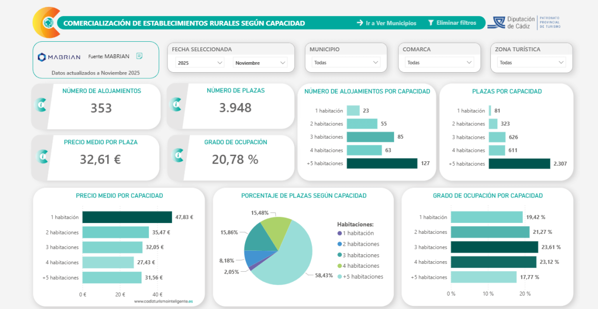 Número de alojamientos, plazas, precio medio por plaza y el grado de ocupación de los alojamientos rurales en la Provincia de Cádiz.
