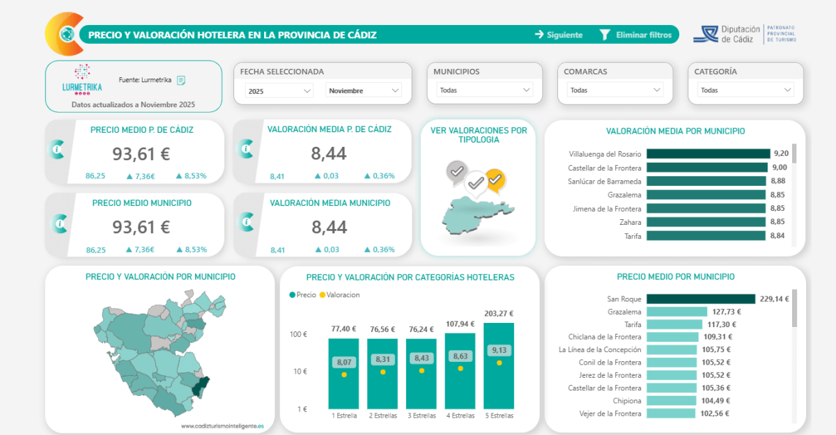 Precios y valoraciones por municipios y categorías hoteleras, así como información de zonas turísticas competidoras y valoraciones en detalle.